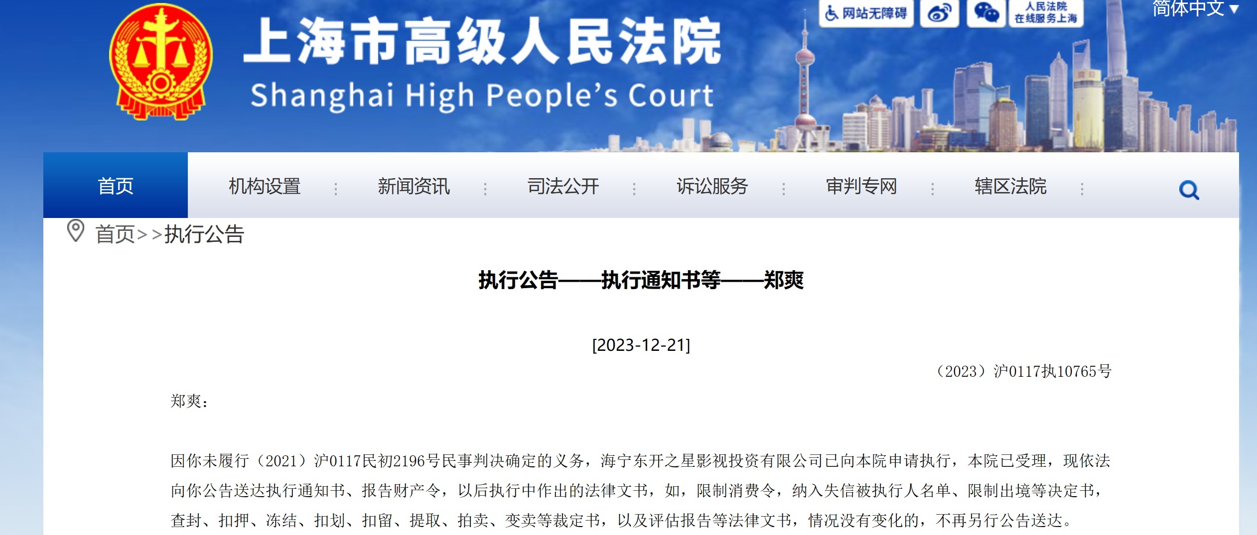 据上海市高档东谈主民法院官网,近日,上海市松江区东谈主民法院照章向郑爽投递公告:因未履行民事判决细方针义务,海宁东开之星影视投资有限公司已向法院肯求履行,现投递履行奉告书、申诉财产令,以后履行中作出的法律通知等,如,抑遏奢侈令,纳入失信被履行东谈主名单、抑遏出境等决定书,查封、扣押、冻结、扣划、幽囚、索要、拍卖、变卖等裁定书,以及评估申诉等法律通知澳门太阳城集团,情况莫得变化的,不再另行公告投递。